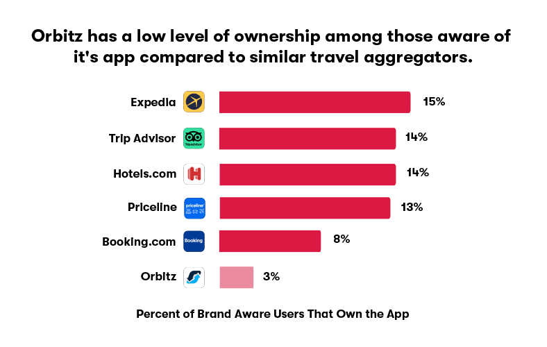 We surveyed consumers on several travel aggregators, including Booking.com, Orbitz, Expedia, and Priceline. Consumer awareness among these apps doesn’t vary significantly as you can see in the chart. Orbitz, however, has only a 3% ownership among those aware - a number seriously dwarfed by other users in the space including 5x lower than Expedia, which is owned by the same company. Thus, by creating a strong cross- affiliation in their ad campaigns, Expedia could help Orbitz grow users.