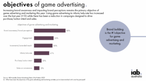 Goals for in-game advertising vary, yet the number one objective for advertising in games is to build brand awareness, followed by increasing engagement.