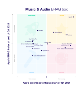 The BRAG Index, or Brand Relative App Growth Index, is a first of its kind report released by Digital Turbine and Apptopia in May 2022. The BRAG Index measures a brand’s app installs against its brand funnel (defined as consumer awareness and install intent) to find brands that had app growth that transcended its market presence. The BRAG Blog gives you deeper insight into our findings. Read the full report here.Ring a BellMusic & Audio has some similarities to Streaming Video in that there is a fierce battle for consumers dominated by several well known brands: Amazon Music, Spotify, Pandora, iHeartRadio, and Apple Music. All of these apps had awareness over 70%. On the other hand, the category also had several lesser known brands with 7 apps having awareness of less than 10%. Intent to install was also fairly disparate with the better known brands all having high levels of intent (with one exception) and the lesser known brands having low levels on install intent even among those aware of the app. The category mostly shook out as you one might hypothesize: with the brand leaders garnering the most installs. But if you’ve been a follower of the BRAG Blog, there are always exceptions with apps blowing away their growth expectations. Spotify was one leader that shattered expectations, while Shazam and Audiomack were two apps with lower awareness that transcended their growth potential. What’s in the Box?