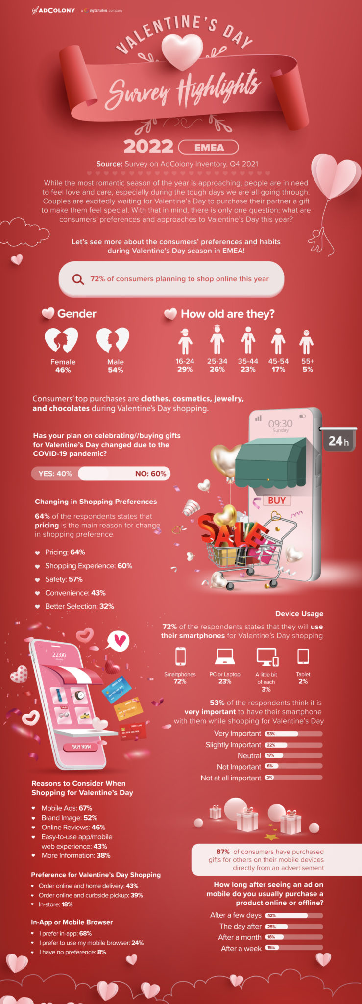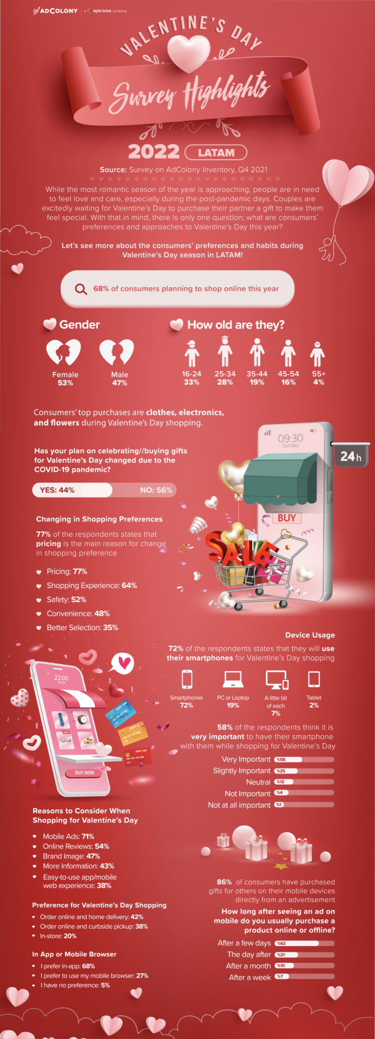 Valentine’s Day is a huge opportunity for brands and marketers to reach consumers. To grab attention during this romantic holiday, user-oriented campaigns are key. Most consumers tend to be online shoppers for Valentine’s Day which means brands should focus on mobile interaction with well-applied and personalized message associations. To clarify how big of an impact mobile ads have on consumers’ shopping preferences, we asked consumers about their approaches to Valentine’s Day this year and the changes in their habits compared to last year.